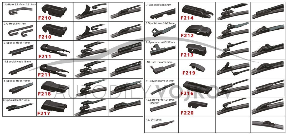 Súčasťou balenia je desať adaptérov, ktoré zaručia možnosť pripojenia na akýkoľvek druh ramienka stierače.